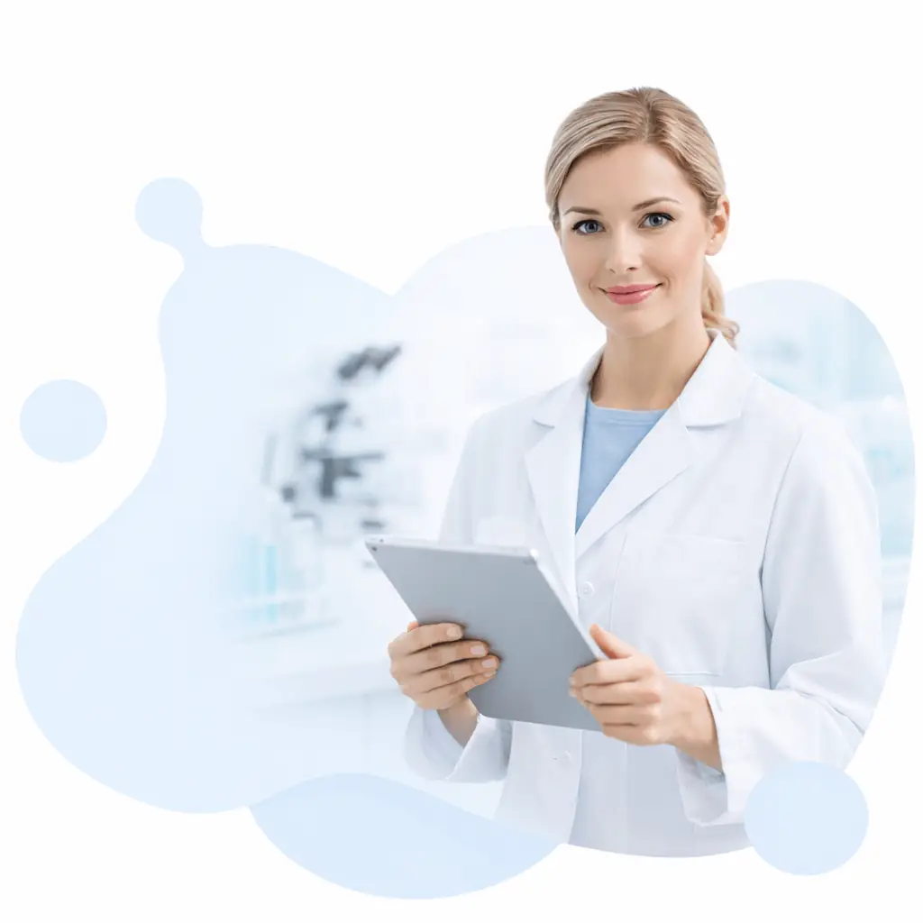 Professional female biotechnician with fair skin in a modern laboratory setting wearing a white lab coat and safety glasses, holding a clipboard, clean white background, 500x500px, high-quality studio portrait