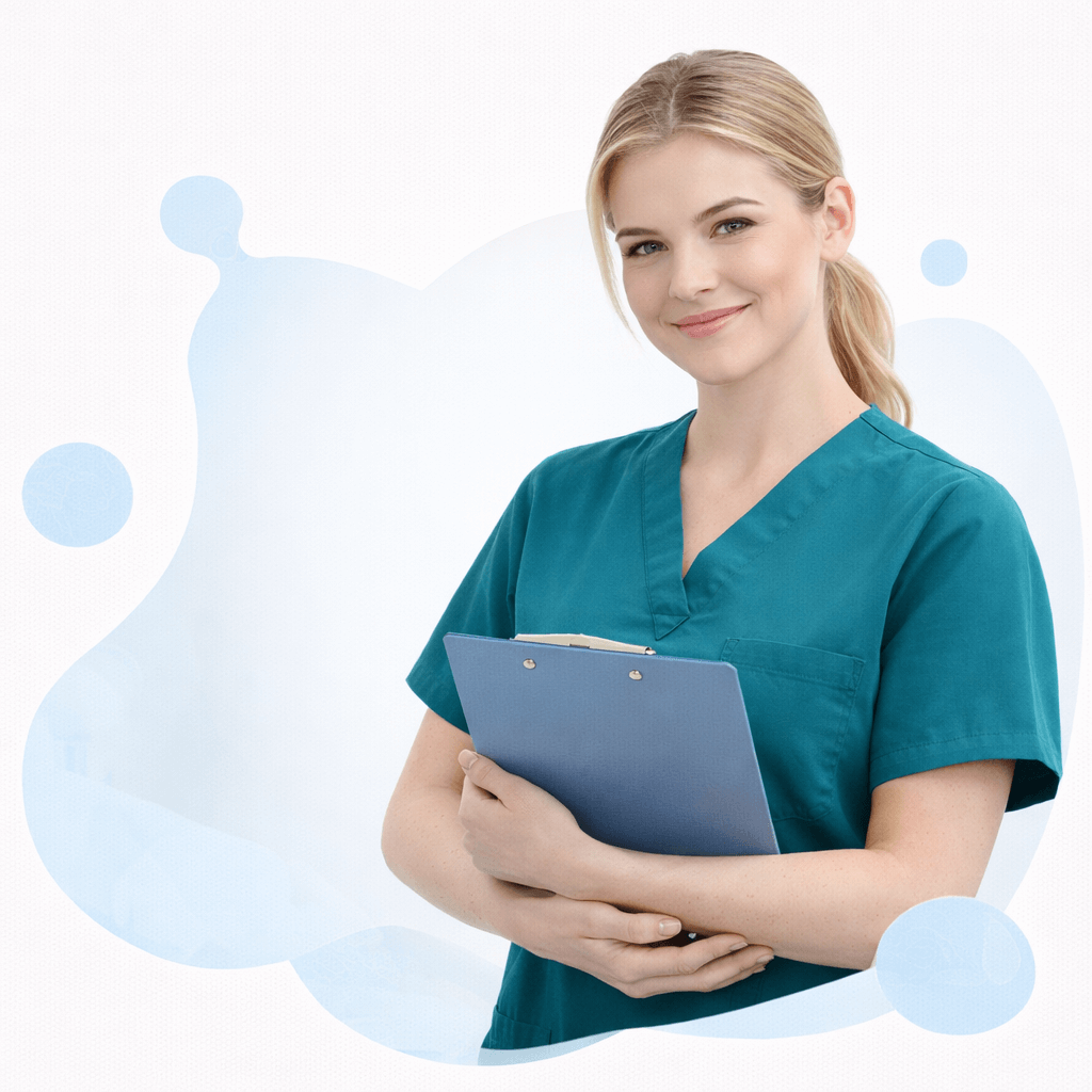 Professional female Medical Assistant with fair skin in teal medical scrubs, holding a clipboard with a warm confident smile, clean white background, 500x500px, high-quality studio portrait.